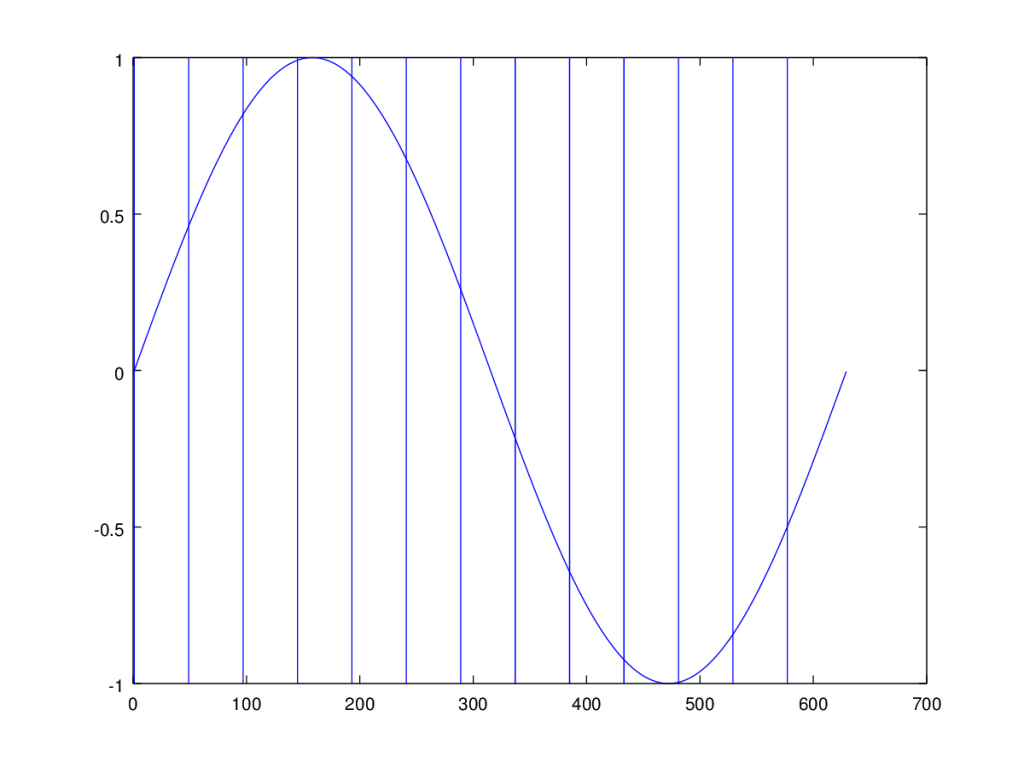 You would be in this view looking for the straightest line possible across the range, parallel to the x-axis, that hits points in the wave, since those points will for a perfectly straight line, have exactly equal range values. So then the question becomes, using something like this approach, how do I compare two subsets of the wave, in the sense that, one could be better than the other, in that one more accurately captures some sub-frequency of the total wave. This would be a balancing act between the number of points captured, and the error between their respective values. For example, how do you compare two points that have exactly the same range value, and ten points that have some noise?