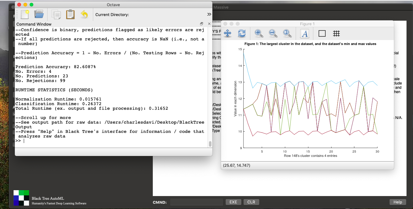 In this case, the accuracy is perfect, despite the absence of a training step, which is actually typical of my software, and there’s a set of formal proofs I presented that guarantee perfect accuracy under reasonable conditions, that are of course violated in some cases, though this (i.e., genetic datasets) doesn’t seem to be one of them. However, I’ll note that the proofs I presented (and linked to) relate to the supervised version of this algorithm, whereas I’ve never been able to formally prove why this algorithm works, though empirically it most certainly works across a wide variety of datasets. It is however very similar to the supervised version, and you can read about the supervised version here.