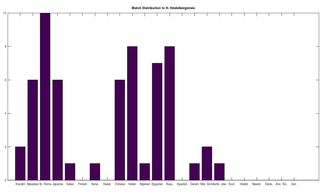 I then compared every row in the genome dataset, which contains 200 complete mtDNA genomes from 18 nationalities, to a complete Homo Heidelbergensis mtDNA genome. This produces a curve for every row of the dataset, compared to Heidelbergensis, of the type shown above. I then ran Nearest Neighbor on the curve, over the training dataset, and tested whether the curve matches to a “good curve”, or a “dudd curve”. If it matches to a “good curve”, then the row is treated as a match for Heidelbergensis, and if instead it matches to a “dudd curve”, then it is not. The results are plotted below, which shows the number of matches, by nationality. As you can plainly see, many modern human beings have a very close genetic relationship to Homo Heidelbergensis, in particular the Iberian Roma, all of which are a match, using this methodology. If this sample is representative of the global population, then approximately 29% of the global population is closely related to this otherwise extinct archaic human population.