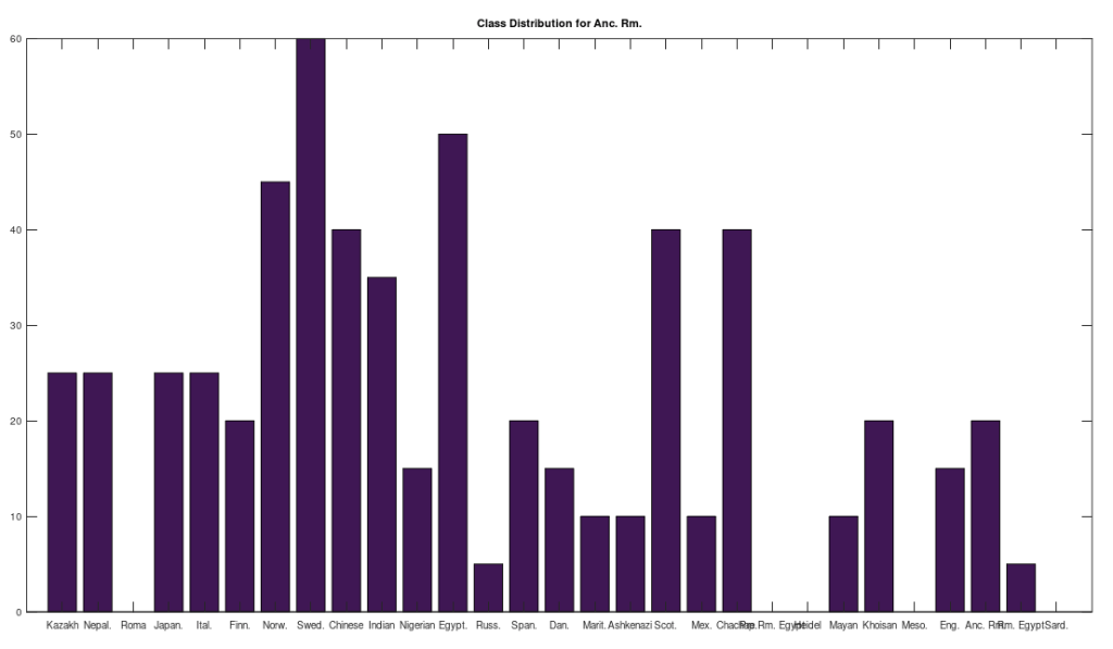 The chart above shows the distribution of matching ethnicities at 30% of matching bases, and you again see a connection to Northern Europe and Asia, as the same is true of the Pre-Roman Egyptians. However, this is a very low threshold, though it is higher than chance, which is 25% of matching bases. This is consistent with the language, since the European languages are generally believed to be derived from early Indian languages. I think the net takeaway is, ancient Europeans seem to come from Asia, and that the Romans were probably annihilated over centuries, possibly by people indigenous to Europe.