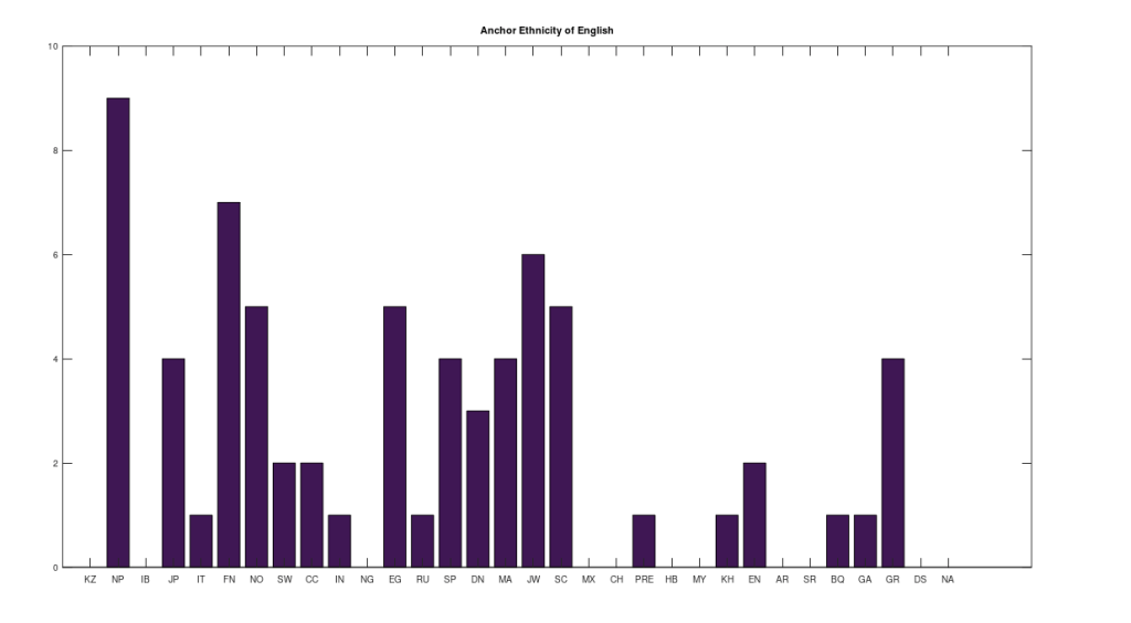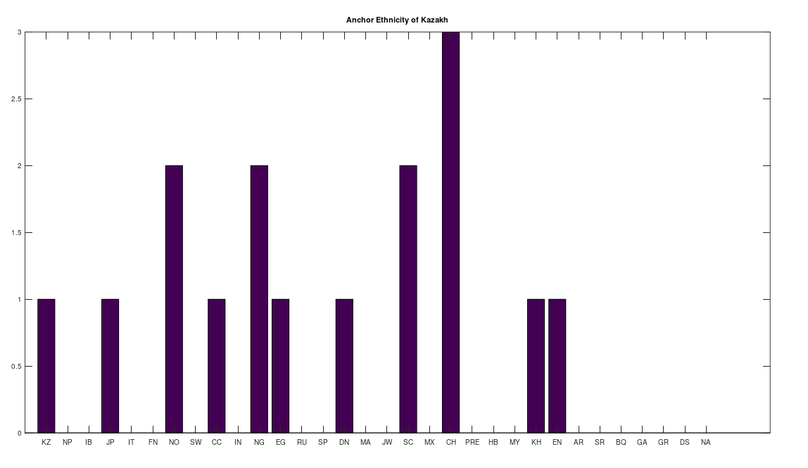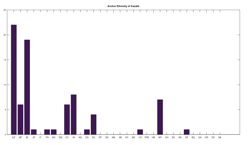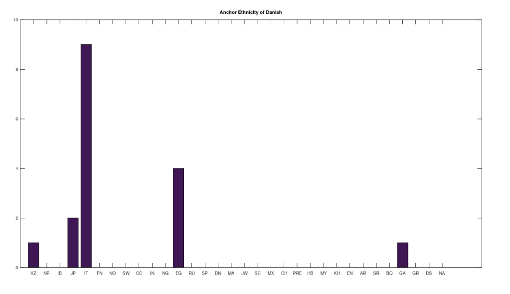 However, many of the clusters have only 1 or 2 genomes. If we instead focus on the clusters that have at least 10 genomes, this leaves 6 clusters, that together contain 255 genomes, or 67.64% of the genomes in the dataset. The 6 rows that survive are called “anchors”, and the title of each chart above shows the ethnicity of the applicable anchor genome that produced the cluster in question. I chose the word anchor because it doesn’t have a meaning in genetics, and these genomes are by definition connected to the largest number of genomes across the dataset. The distributions for each such cluster are also shown. The obvious point being, we are, as a general matter, heterogenous people, and even superficially homogenous nations like Denmark have 99% of their maternal lineage in common with global ethnicities.