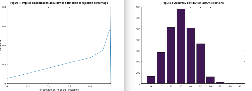 Here are the results, with accuracy plotted as a function of confidence, together with the distribution of accuracies at 90% confidence. I ran this algorithm 5,000 times, over 5,000 random subsets of this dataset, and this is the result over all iterations, so it cannot be a fluke outcome. It seems instead the theory is true empirically.