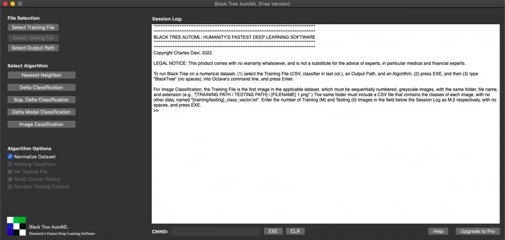 Download the Free Version of Black Tree, which includes (i) data classification and clustering, and (ii) image classification (grayscale only), up to exactly 2,500 rows / images (non-commercial license), or select from the commercial licenses below.