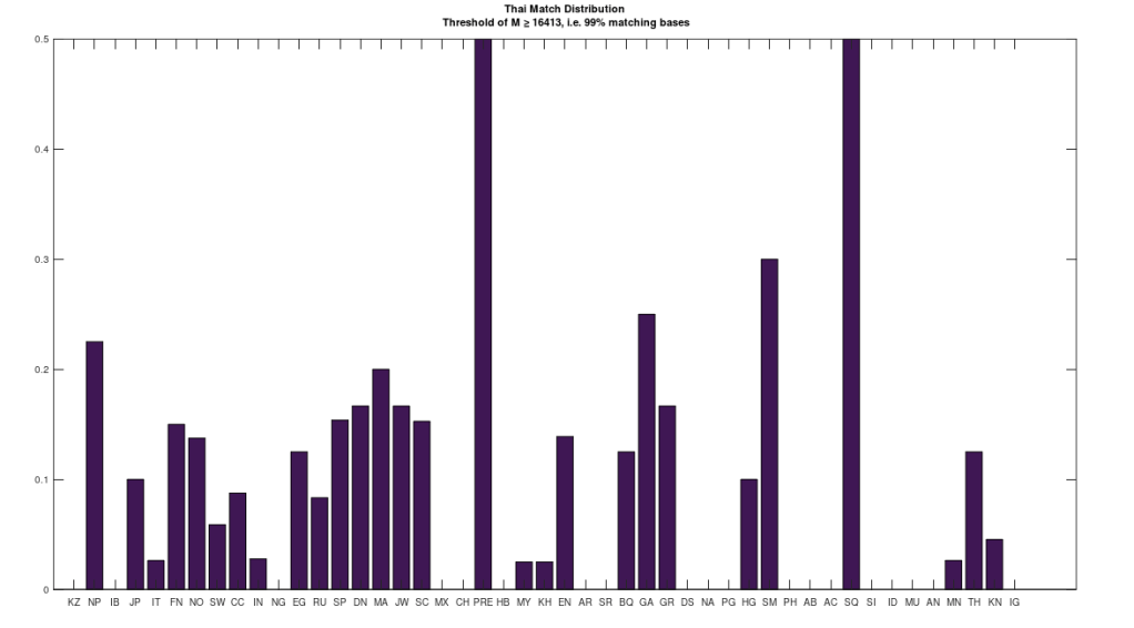 Attached is code that allows you to A/B test populations, and identify where on the genome their bases differ. It also outputs the average number of matching bases. As an example of the theories above, I compared a single Mongolian genome to a single Thai genome, and the number of matching bases is 5,028. Keep in mind that chance implies a match count of one quarter of the genome, which is 4,144 bases. As such, the Mongolian genome and Thai genome have little more than chance in common. I then compared 4 Thai genomes, to the full dataset of ethnicities, and the results are plotted below. The x-axis shows the population acronym (e.g., MN is Mongolian). The full table of acronyms can be found at the end of [1]. If a given Thai genome is a 99% match to e.g., a Norwegian genome, a counter is incremented. The y-axis shows the value of that counter for a given population as a percentage of its maximum. For example, there are 4 Thai genomes, and 20 Norwegian genomes in the attached dataset. As a consequence, the counter for the Norwegian population has a maximum of 80 (i.e., 20 x 4). The chart below shows the value of this percentage for each population on the y-axis, and in the case of the Norwegian population, it is exactly 13.75%. As you can see, there’s a very weak connection between the Thai genomes and the Mongolian genomes, of which there are 19, with a percentage of 2.63%. The plain implication is that despite superficial similarities, Thai people are much closer to Norwegian people, than they are to Mongolians.