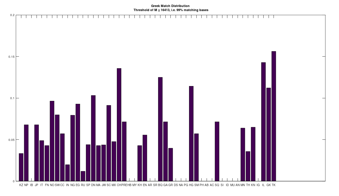 I’ve expanded my dataset of human mtDNA to include 14 Greek genomes, and 16 Turkish genomes. The results are interesting given the historical animosity, and violence, between Greeks and Turks, in that they are very similar people. In fact, the main reason I’m writing this note is because the Turks are closer to the Greeks genetically, then the Greeks are to themselves. That is, the match score between Greeks and other Greeks is lower than the match score between Greeks and Turks. Intuitively this sounds suspicious, but it actually makes perfect sense –
