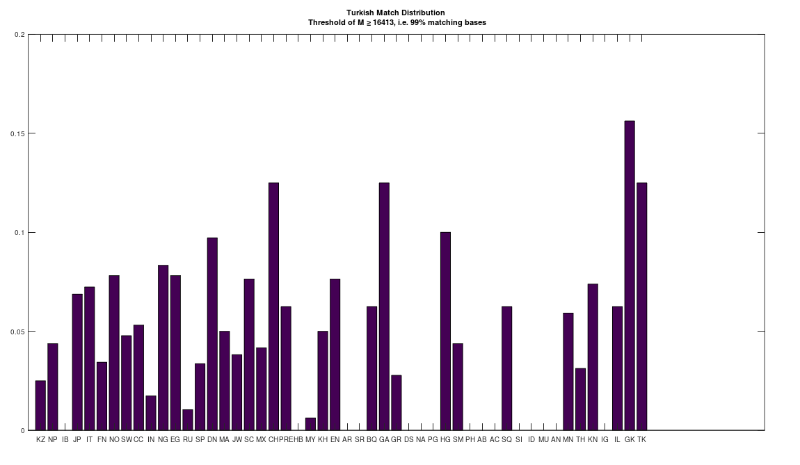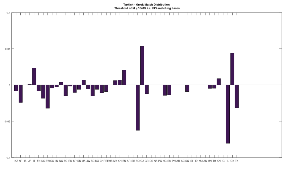 The Greeks are closer to the broader set of Europeans (and others) than they are to themselves, implying a heterogenous population of global people, including Turks. That is, the Greek population plainly includes a significant number of people that are basically identical to people that live in Turkey, and are ethnically Turkish, though they’ve likely forgotten this, and instead identify as Greek. Recall, all the genomes in my dataset are diligenced to ensure that the person in question is e.g., ethnically Chinese, as opposed to simply located in China. So in this case, all of the Turkish genomes are from people living in Turkey, that are identified as ethnically Turkish, and the same is true of the Greeks. Below you can find the distribution of 99% matches between the Greeks and everyone else (left), and the Turks and everyone else (right). As you can see, they’re similar populations. The population acronyms can be found at the end of my paper, A New Model of Computational Genomics (e.g., TK is Turkish).