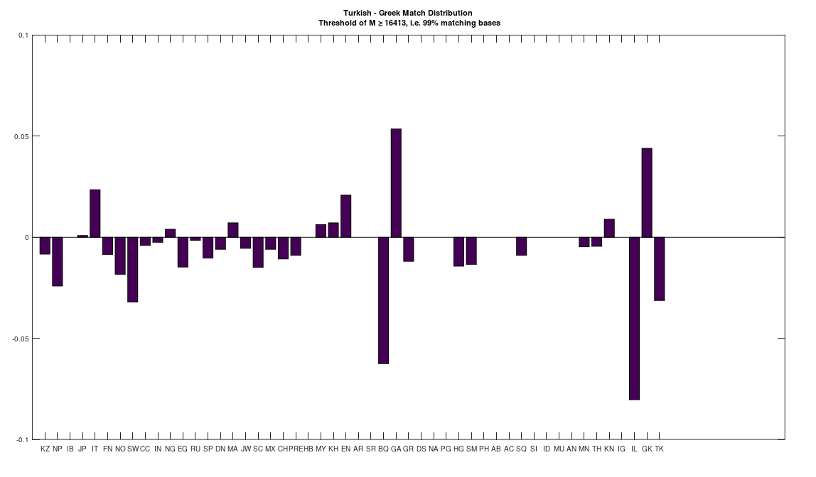 In order to refine the analysis, I produced a third chart (below) that shows the difference between the match scores for each population, to get a better sense of the difference between Greeks and Turks. All I did was literally subtract the Greek match score for a given ethnicity from the Turk score for that same ethnicity, causing the range (i.e., y-axis) to vary from -1 to 1, though as you can see the differences are extremely small, and are instead bounded by -0.1 and 0.1 (i.e., 10%). This tells us that the distribution of global blood lines in Greece and Turkey are very similar (i.e., within 10% of each other), and you can see my earlier point, that the Turks are more Greek than the Greeks, in that the match score between the Turks and the Greeks is higher than the match score between the Greeks and the Greeks. And again, this makes perfect sense, if a large number of people with Turkish ancestry live in Greece, and nonetheless identify as ethnically Greek, due likely to forgotten history, which is obviously possible.