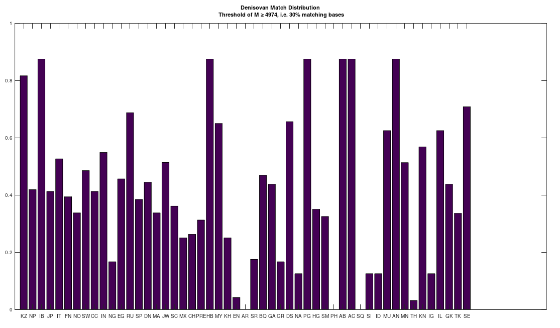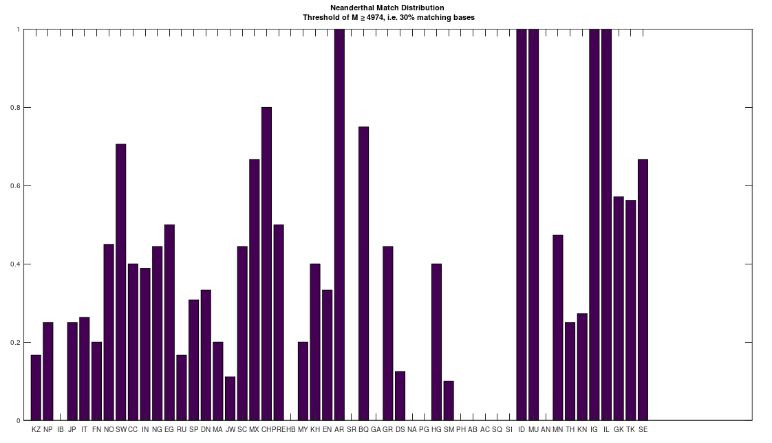 To test this, I lowered the minimum match count to 30% of the genome, and compared the full dataset of genomes to Denisovans, Heidelbergensis, and Neanderthals. The results are plotted below, where the x-axis shows the acronym of the population in question, and the y-axis shows a normalized count of matching genomes, where a given genome constitutes a match if it has at least 30% in common with the applicable archaic genomes. The table of acronyms can be found at the end of [1], and there are links to the dataset I used in [1] as well. All genomes are complete mtDNA genomes taken from the NIH website.