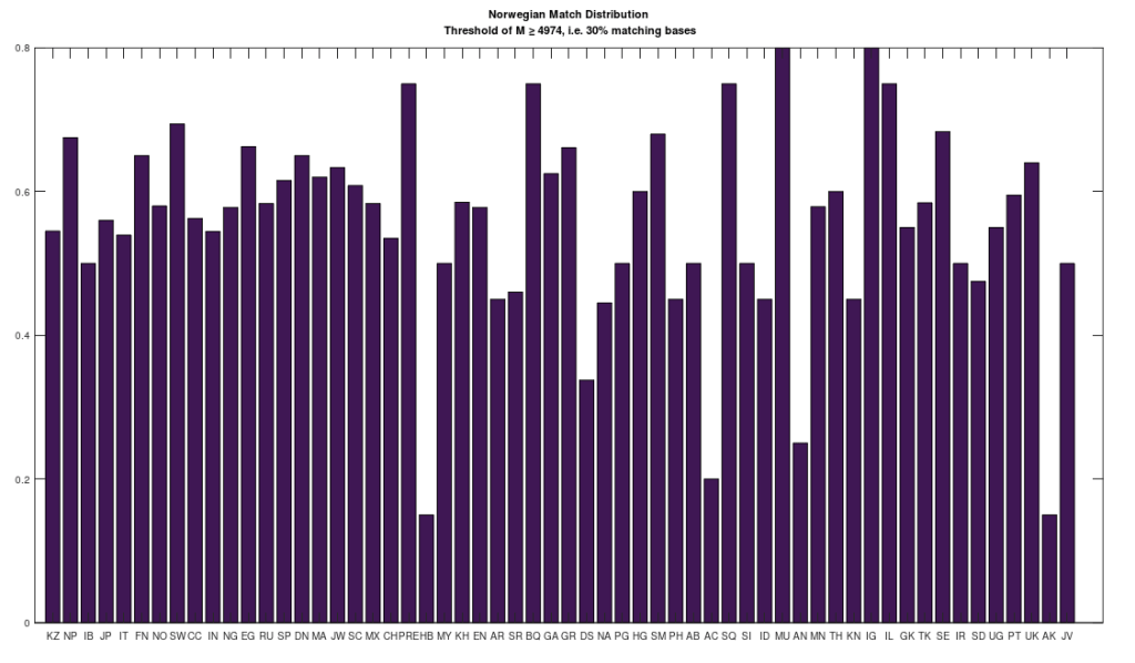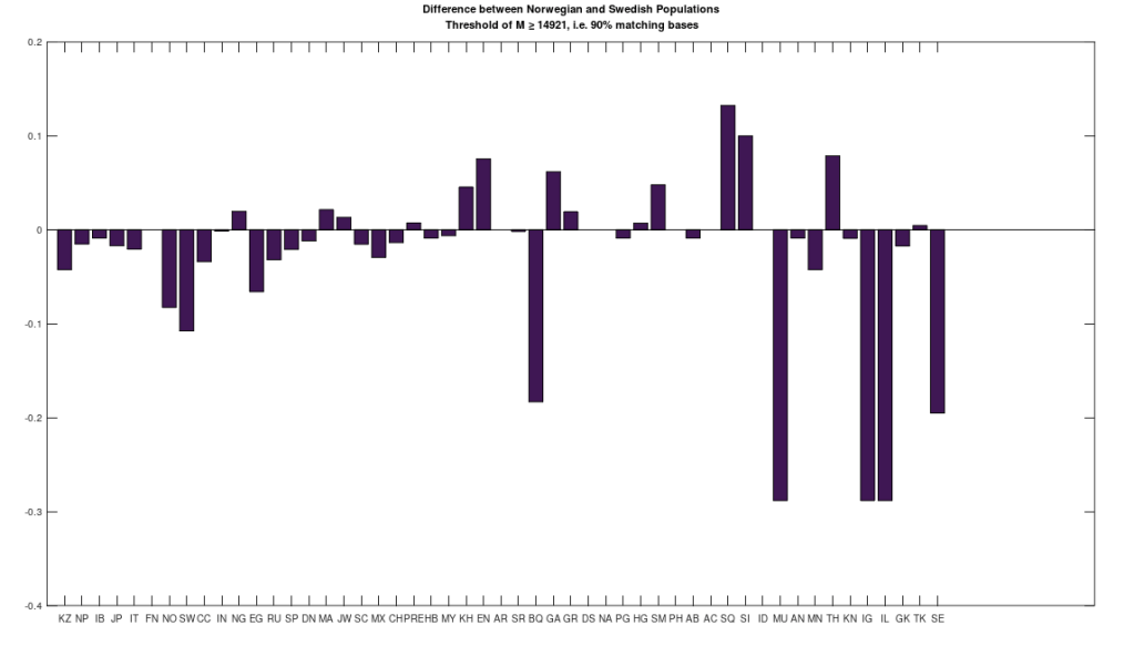 If you actually compare the distribution of associated ethnicities between Norwegians and Swedes, you get the chart below, which plainly shows that the Norwegians are much closer to the people of the Pacific, indigenous peoples generally, and some Africans. Specifically, TH stands for Thai (obviously in the Pacific), SI stands for the Solomon Islands (islands in the Pacific), SQ stands for the Saqqaq (indigenous people of Greenland), SM stands for Sami (indigenous peoples of Scandinavia and Russia), NG stands stands for Nigeria, and KH stands for Khoisan (a people in Southern Africa). The complete list of acronyms can be found at the end of [1]. The chart below shows a normalized rank for the Norwegians (i.e., a scale from 0 to 1), minus that same rank for the Swedes. This causes the values to range from 1 to -1. The rank for a given column is the normalized number of matches at 90% of a given genome, and all genomes are complete mtDNA genomes taken from the NIH database. That is, the algorithm first counts the number of Norwegians that are e.g., a 90% match to the Nigerians, and then normalizes that number from 0 to 1, with 0 being none of them, 1 being all of them. Then, that same data is produced for the Swedes, and the chart below shows the difference between the two. Informally, this is Norway minus Sweden, and so, e.g., column 1 shows that the Swedes are closer to the Kazakhs than the Norwegians (note that KZ stands for Kazakh), since it is a negative number.