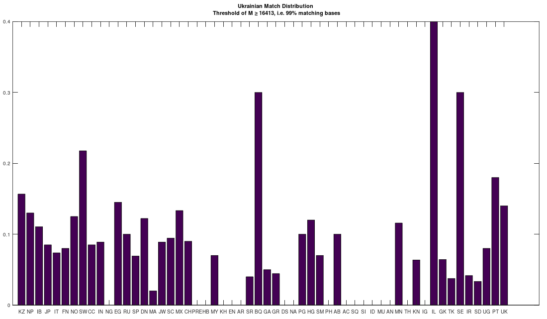 I hypothesized that many Ukrainians would be related to the Vikings, because of my admittedly loose understanding of the history, and it seems that I was correct. Specifically, the Ukrainians appear to be a mix of both Russian (not surprising) and Scandinavian heritage. What is surprising, is that they are also closely related to the Pashtuns of Afghanistan and Pakistan, who were also subjected to genocide by the Russians. This might be a coincidence, but I doubt it at this point, and I suspect instead, that this group of people (which includes many Jews, both Sephardic and Ashkenazi) has been the target of genocide for at least a century at this point, and that many Communist states deliberately exterminated exactly this bloodline of people. The chart below shows the distribution of ethnicities that are a 99% match to the Ukrainians.