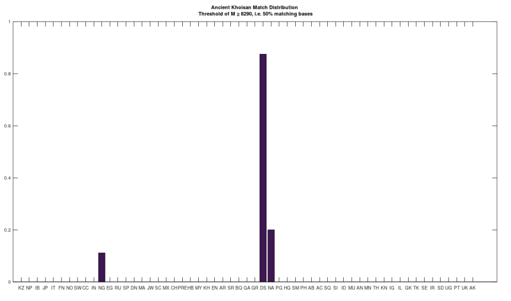 There are two possibilities: one is that the Nigerians had a fleeting relationship with Denisovans, which caused only subtle changes to their mtDNA (see Section 5 of [1]). The other possibility is that they have an ancient, and possibly archaic connection to Denisovans. There is an ongoing search for so-called “Southern Denisovans”, since Denisovan fossils are typically found in Asia, not Africa. If Denisovans are actually from Asia, then we should not find ancient Denisovans in Africa. As it turns out, this particular genome is closely related to both Denisovans and Neanderthals, and is much closer to Denisovans than Neanderthals. You’ll also note that this genome is related to the Nigerians, again suggesting, an ancient connection between the Denisovans and Nigerians. Though this is not an archaic genome, since it’s only about 3,000 years old, it is ancient, and therefore consistent with the hypothesis that all hominins, i.e., Denisovans, Homo Sapiens, Neanderthals, and Heidelbergensis, all come from Africa. Below is the normalized match count for the Ancient Khoisan genome, at 50% of the genome. All of the code you need to run this analysis is in [1], and the dataset can be found here.