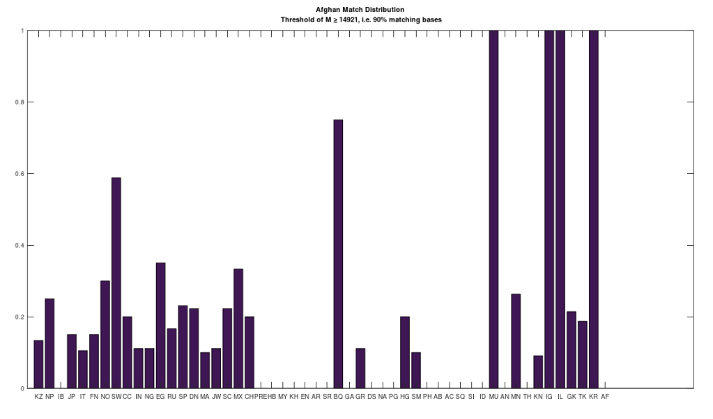 I’ve tested a few Pashtun mtDNA genomes, again taken from the NIH Website, and it’s obvious that they’re related to the Basque, and the Northern Europeans generally. This is not the case for Iranians, though the Iranians are also related to Europeans (just not as obviously related to the Northern Europeans). One sensible theory is that this is the result of the Bactrian Empire, which occupied much of present day Afghanistan. The match count for the chart below is set to 90% of the genome (i.e., a genome from a given population is treated as a match only if it is at least a 90% match to the Afghan genome). If you’re interested in the methods, see my paper, A New Model of Computational Genomics [1]. It is at this point obvious to me that someone is committing genocide against this group of people, which is a global population of people that seem to have historical ties to Asia, and includes many Jews, but not all Jews. The Jews are obviously split into two totally different people: one group is Northern European, and the other is definitely Denisovan. See [1] generally. The Jews are not unique in this regard, as 100% of the Iberian Roma and Papuans are a 95% match to Heidelbergensis. The obvious takeaway is that these ostensibly archaic species are alive today.