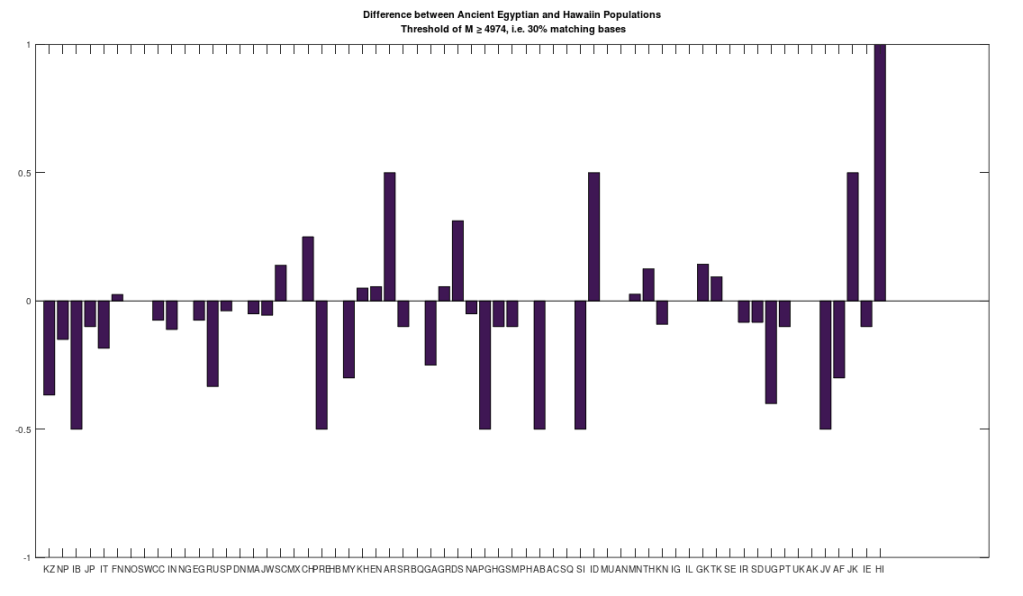 In any case, both populations plainly did not mate with archaic humans, in any appreciable amount, since they have so few bases in common with archaic humans. See Section 5 of [1]. For intuition, again, selection can cause two distinct mtDNA lines to converge into a new third genome, which would cause, e.g., homo sapiens to have many bases in common with archaic humans, which is the case with, e.g., many Finns, that have more bases in common with Denisovans than they should without selection. In this case, as you can see in the chart above, which shows the differences between the Hawaiians and Ancient Egyptians at 30% of the genome, the Hawaiians are closer to the Roma populations (e.g., the Iberian Roma, Russians, and Papuans) than the Ancient Egyptians are. Note that IB stands for Iberian Roma, and all of the applicable acronyms can be found at the end of [1]. The chart above is constructed by fixing a threshold match percentage, in this case 30%, and then calculating a normalized percentage within each population that are a match to e.g., the Ancient Egyptians. So, e.g., if one Norwegian is a 30% match to at least one Ancient Egyptian, then a counter is incremented for the Norwegian population, and this is done for every genome in the dataset. Those counters are then normalized to [0, 1]. The chart above shows the differences between the match distributions for the Ancient Egyptians and Hawaiians, producing a chart over the interval [-1, 1].