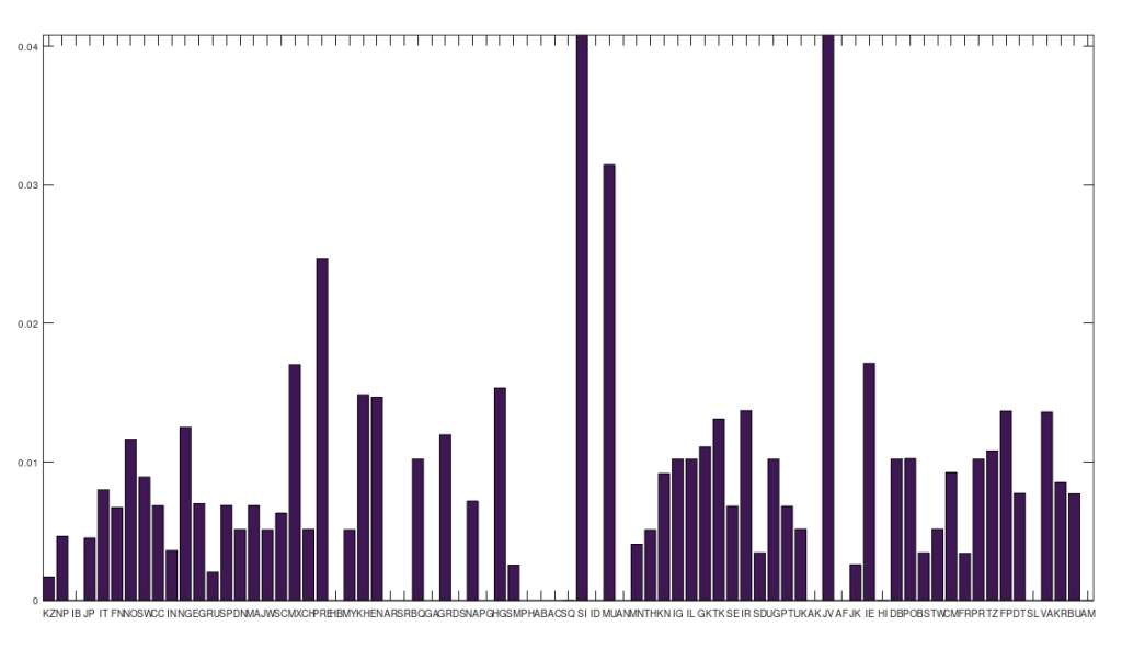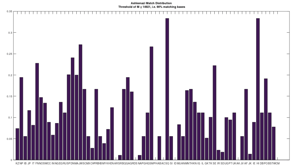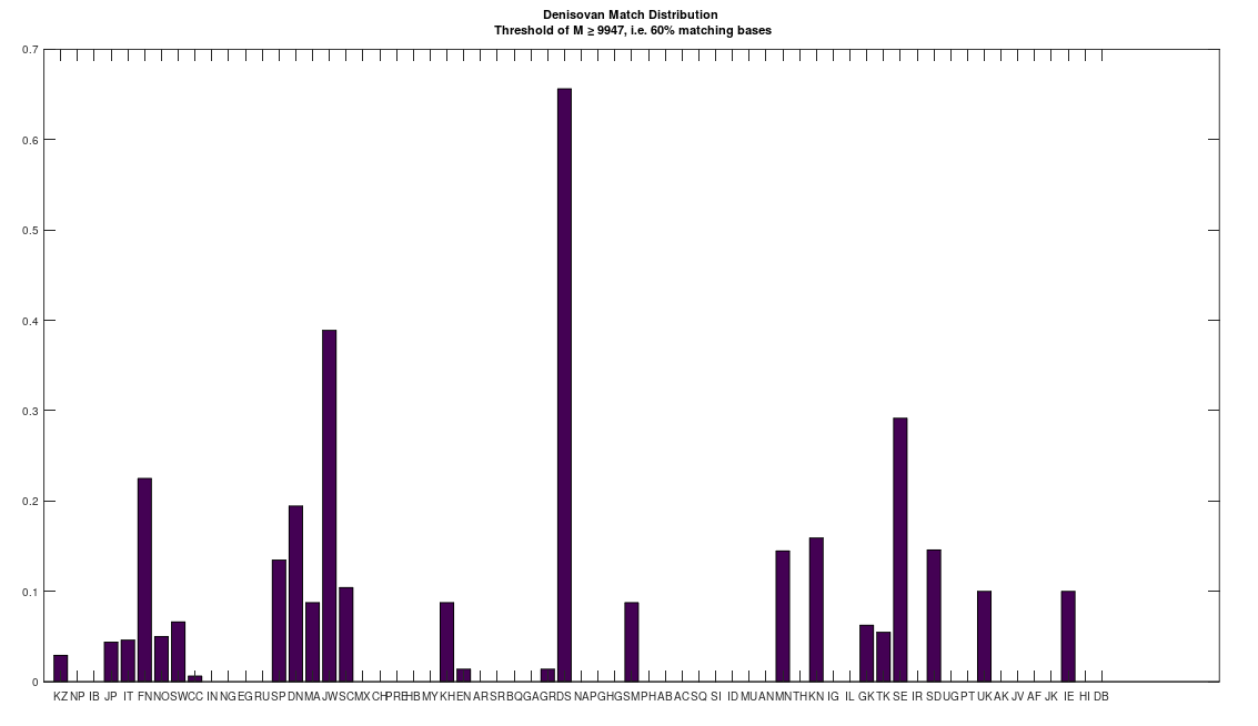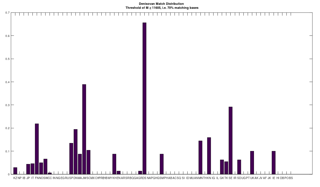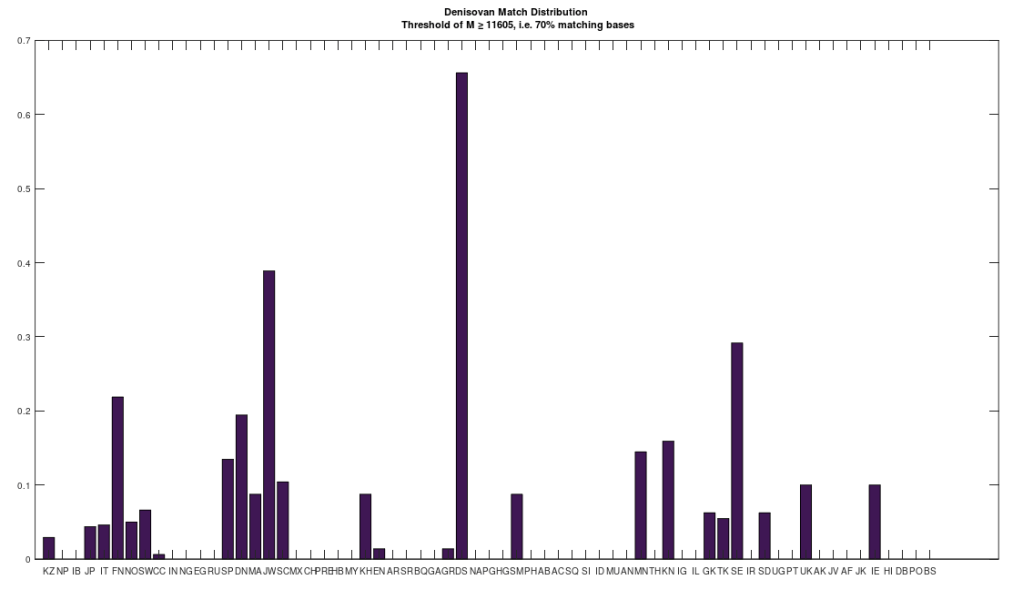 I’m in the process of unpacking the history of humanity using my machine learning software, and as part of that process, I decided to take a closer look at Denisovans. Specifically, many modern populations have individuals that are a 70% match to Denisovans. In particular, the Jews and Finns have large populations of people that are a 70% match. Below is a distribution that shows a normalized percentage of each population that is at least a 70% match to the Denisovans. The x-axis shows the acronym for the particular population, and all of the acronyms can be found at the end of my paper, A New Model of Computational Genomics [1]. You can also find all the software you need to run these experiments, in addition to the related technical information on alignment, process, etc., in [1].