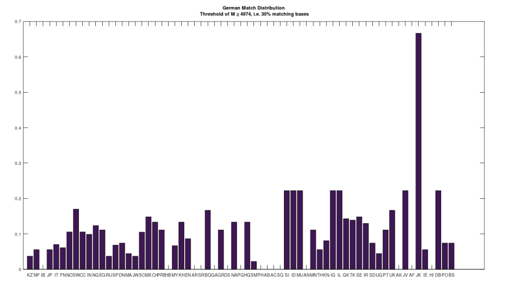 Today I developed a new technique that looks at the gaps in matches that occur as a result of insertions and deletions. That is, if you align to genomes, and then shift one of them by a single base at index i, the match count along indexes i + 1 through N (i.e., the genome size) will be reduced to chance. The question is, is there selection in those gaps? The answer is plainly yes, and by testing for it, you can determine paternal ancestry. Specifically, start with a genome, and then compare that genome to every genome in a given population (e.g., a single Ancient Egyptian genome compared to every Norwegian genome in a dataset). If Norwegians played a role in selecting Ancient Egyptian women (probably not true), then in the gaps, we should find evidence of selection, which would manifest as a number of matches that exceed chance. We can then measure the density of these above-chance matches within the gaps, which is consistent with selection by males from that population. Note that the criteria of materially exceeding chance provides an objective test, which is attractive, because you don’t have such a test in the non-gaps.