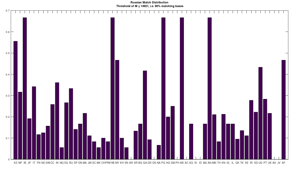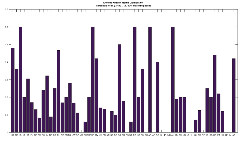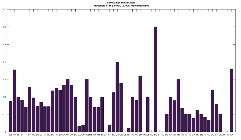 I read an article last night claiming that a set of ancient Finnish remains from the Iron Age is related to the Sami people. I don’t disagree, but they’re much closer to the Russians than the Sami, and in general, these are plainly Roma people, that are in turn related to Heidelbergensis (just like the Russians). I’m not going to completely dismiss the results of a peer-reviewed article in Nature, though at the same time, my work is incomparably more precise than typical genetic analysis. See Section 7.1 of A New Model of Computational Genomics [1]. As such, I’m going to assume that they are related to the Sami (which is consistent with my work), and that the modern day Sami are a mix between these ancient people, and others that do not descend from Heidelbergensis, which would produce the match distribution on the left below, for the modern Sami, that shows a mix of Roma and non-Roma populations. So on net, I would say that this ancient Finnish population eventually mixed with people that are more closely related to modern day Sami, specifically the Saqaaq, over time, eventually producing the modern genetic distribution of the Sami people.