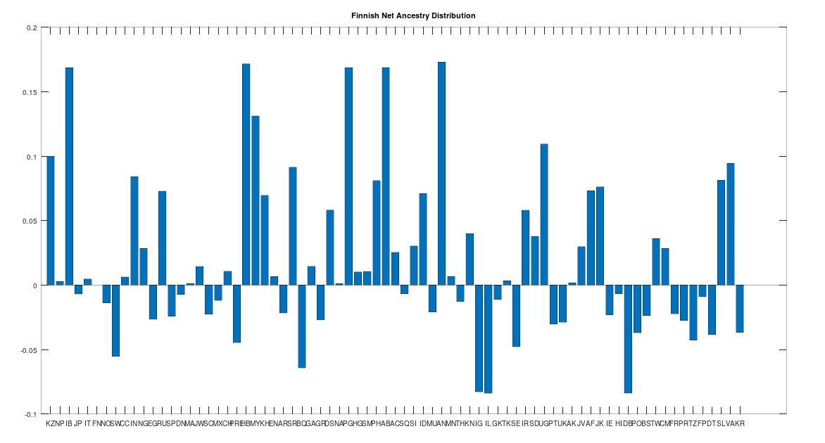 Levänluhta is an underwater gravesite in Finland that contains the remains of about 100 individuals from the Iron Age (c. 800 to 500 BC). Though Scandinavia has been occupied by humans since the Stone Age, common sense says that these individuals should test as the ancestor of at least some modern Scandinavians. This is indeed the case, and in fact, these individuals test as even more ancient than the Sami People, which you can see in the chart below. A positive number indicates that the population in question is a net ancestor, whereas a negative number indicates that the population in question is a net descendant. That is, if e.g., X is the number of times the ancestry test was satisfied from Sweden to Norway, and Y is the number of times the ancestry test was satisfied from Norway to Sweden, the chart below plots X – Y for each population. As you can see, all other Scandinavian groups test as the descendants of the individuals buried in Levänluhta. You can find the acronyms used below at the end of [1], but for now note that FN = Finland, NO = Norway, SW = Sweden, DN = Denmark, SM = Sami, IL = Iceland, and AF = Ancient Finland (i.e., Levänluhta). If you look at the ancestors of the individuals buried in Levänluhta (i.e., X – Y > 0), you’ll see HB = Heidelbergensis, AN = Andamanese, and other archaic populations, suggesting the individuals buried in Levänluhta are somewhere between archaic humans and modern humans, despite being a relatively recent Iron Age gravesite.