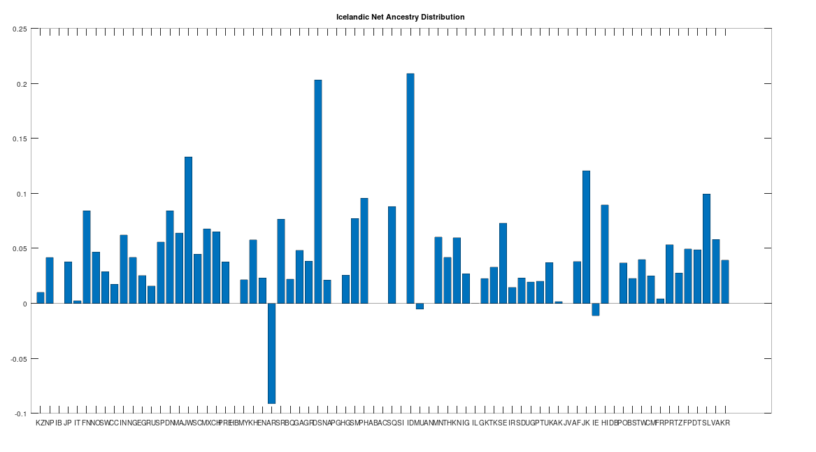 There is only one Icelandic genome in the dataset, but as you can see below, it is very similar to the Swedish population generally. Further, this genome tests as the descendant of all Scandinavian populations, and more generally, has only three descendants: the Ancient Romans, the Irish, and the Munda people of India. The Ancient Romans generally test as the descendants of the Northern Europeans, and are in fact the most modern population in the dataset according to this test. The Munda people of India are probably not Scandinavian, and instead, the Scandinavians and the Munda presumably have a common ancestor in Asia, consistent with the “Migration-Back Hypothesis” I presented in [2], that humanity begins in Africa, spreads to Asia, and then back to Northern Europe and Africa, as well as spreading into East Asia. Dublin was founded by the Vikings, so it is no surprise that some Irish test as the descendants of the Icelandic. However, there is only one Icelandic genome in the dataset, and so while we can’t say much about the Icelandic people in general on the basis of the dataset alone, because Iceland was (to my knowledge) uninhabited prior to the Vikings, it’s presumably the case that the people of Iceland are literally direct descendants of the Vikings, whereas in contrast, Scandinavia (as noted above) has been inhabited by humans since the Stone Age.
