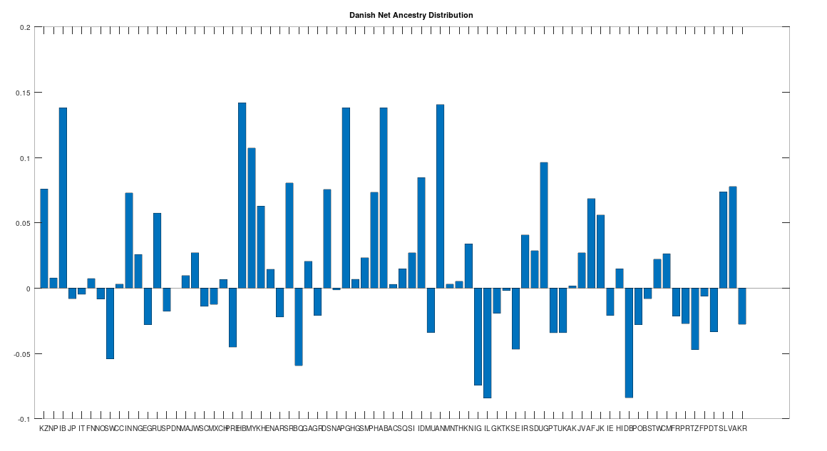 You’ll note in the charts above that some African and Asian people test as the ancestors and / or the descendants of the Scandinavians, in particular the Nigerians and Tanzanians, and the Koreans, Thai, and Japanese (though there are others). Though this might initially seem puzzling, it is instead perfectly consistent with the Migration-Back Hypothesis presented in [2], which asserts that many modern humans, in particular Northern Europeans, East Asians, and many Africans are the descendants of common ancestors from Asia.